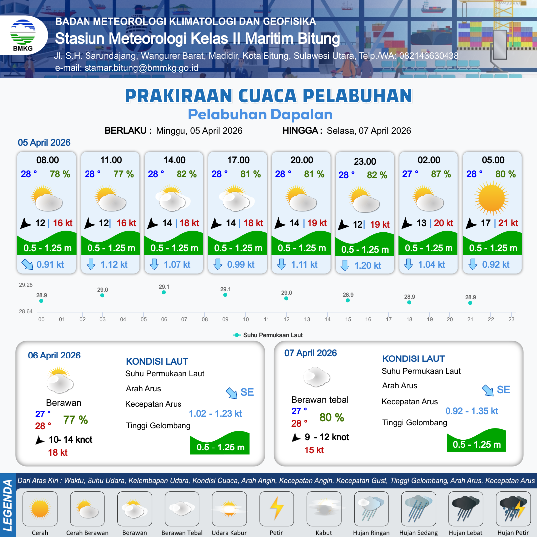 4 Apr 26, 23.00 4 jam kedepan | Cerah Berawan | Timur Laut 11 kt Gust Peningkatan kecepatan angin yang singkat dan tiba-tiba : 16 kt | | | 9 km | 28 °C | 80 % | +0.53 m |