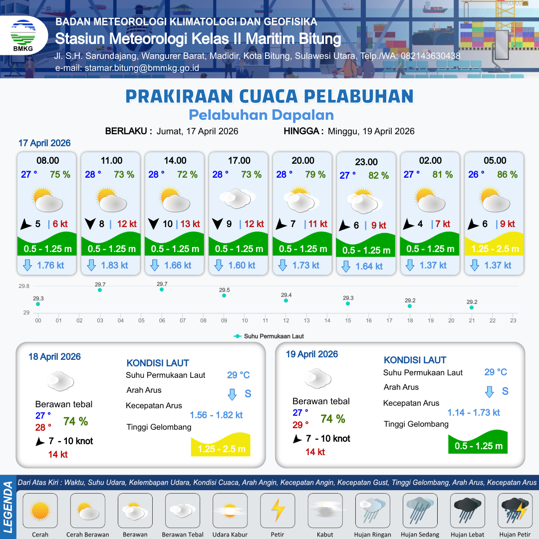 17 Apr 26, 11.00 2 jam kedepan | Timur Laut 7 kt Gust Peningkatan kecepatan angin yang singkat dan tiba-tiba : 12 kt | 1.2 m Rendah | Selatan 1.7 Knot | 10 km | 28 °C | 77 % | +0.52 m | |