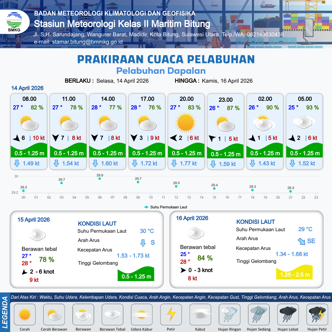 14 Apr 26, 13.00 7 jam yang lalu | Cerah Berawan | Timur 2 kt Gust Peningkatan kecepatan angin yang singkat dan tiba-tiba : 6 kt | | | 10 km | 27 °C | 84 % | +0.52 m |