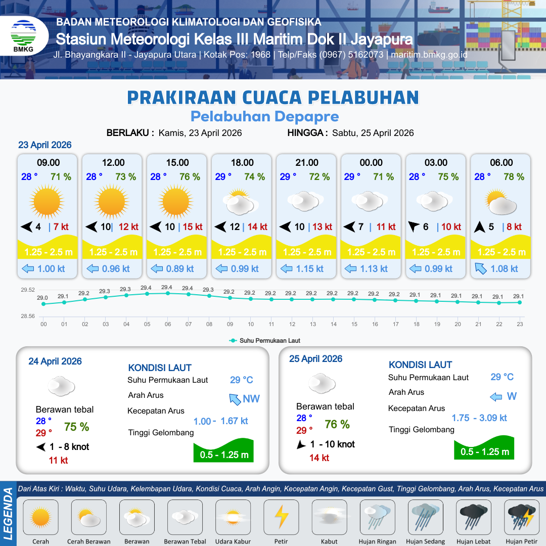 23 Apr 26, 08.00 22 jam kedepan | Timur 12 kt Gust Peningkatan kecepatan angin yang singkat dan tiba-tiba : 14 kt | 1.3 m Sedang | Barat 1.0 Knot | 10 km | 29 °C | 74 % | -0.67 m | |