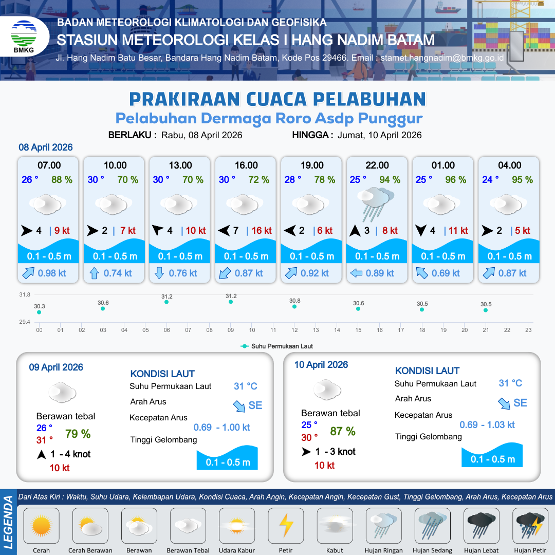 7 Apr 26, 08.00 12 jam yang lalu | Hujan Ringan | Barat Daya 4 kt Gust Peningkatan kecepatan angin yang singkat dan tiba-tiba : 9 kt | | | 10 km | 30 °C | 70 % | +0.63 m |