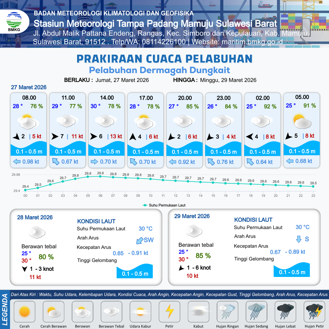 27 Mar 26, 05.00 14 jam yang lalu | Berawan Tebal | Barat 6 kt Gust Peningkatan kecepatan angin yang singkat dan tiba-tiba : 13 kt | | | 10 km | 30 °C | 78 % | +0.11 m |