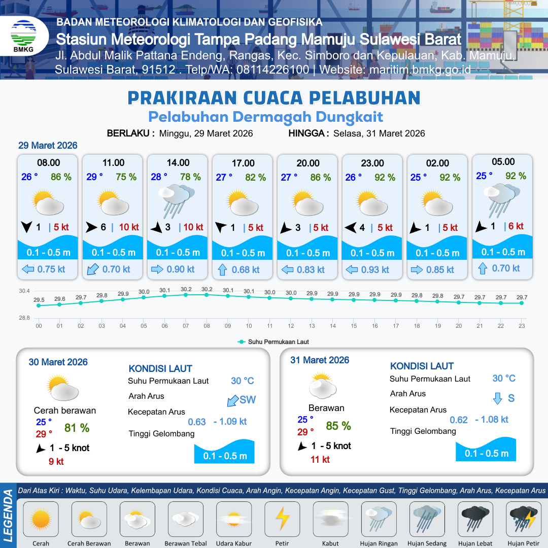 29 Mar 26, 16.00 8 jam kedepan | Timur 4 kt Gust Peningkatan kecepatan angin yang singkat dan tiba-tiba : 5 kt | 0.2 m Tenang | Barat 0.8 Knot | 10 km | 25 °C | 94 % | -0.22 m | |