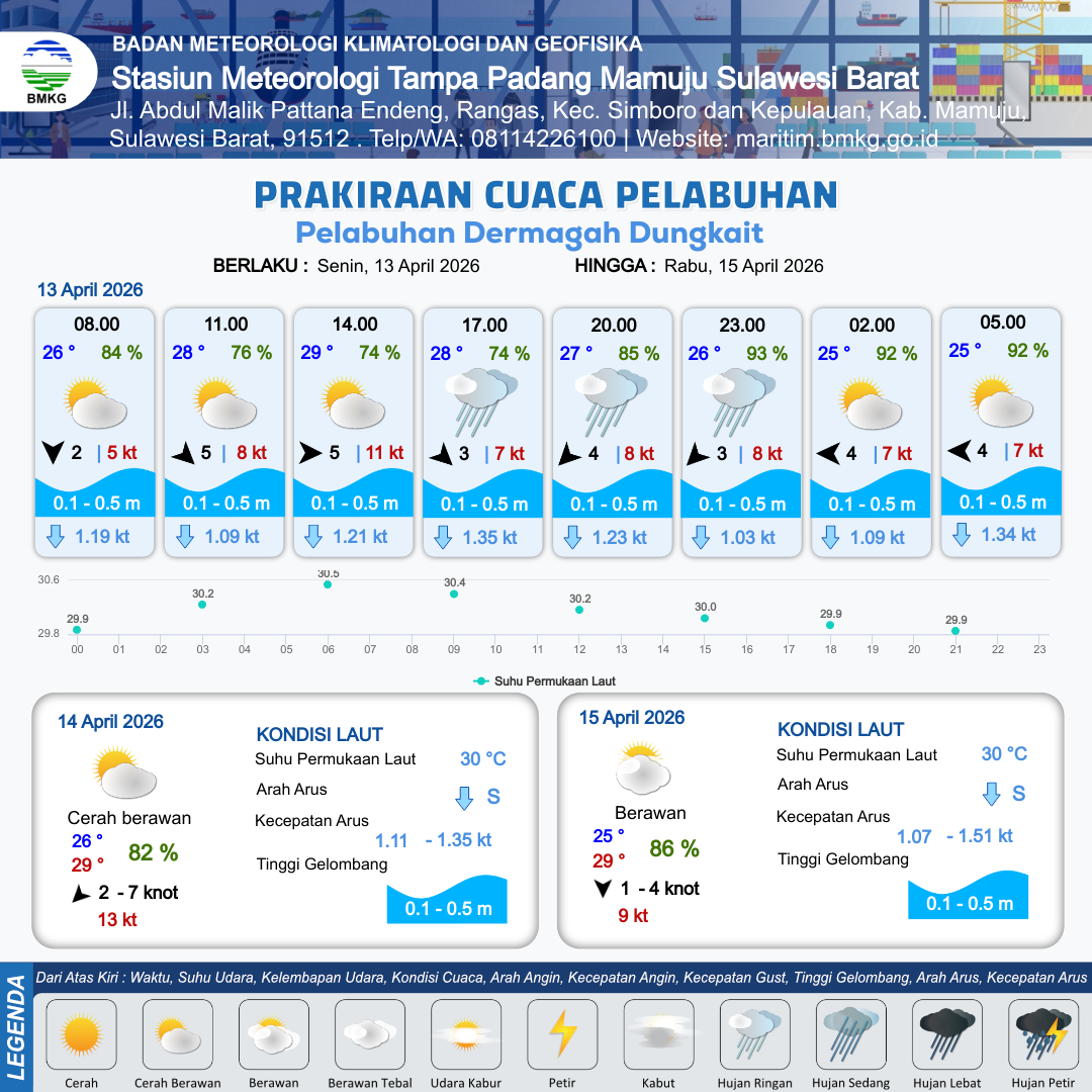 13 Apr 26, 08.00 4 jam kedepan | Barat Laut 3 kt Gust Peningkatan kecepatan angin yang singkat dan tiba-tiba : 8 kt | 0.3 m Tenang | Selatan 1.4 Knot | 10 km | 29 °C | 71 % | - m | |