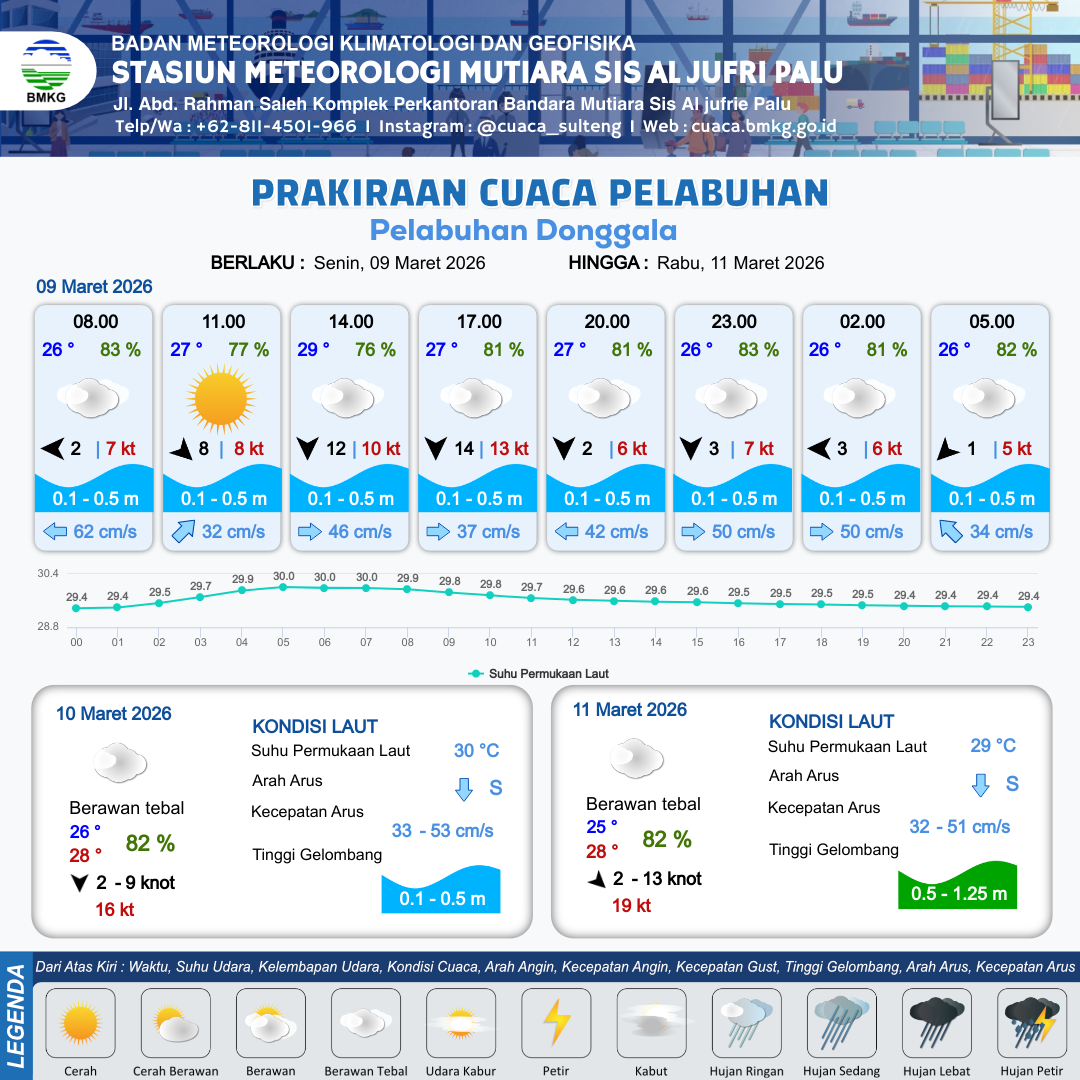 9 Mar 26, 23.00 6 jam kedepan | Berawan Tebal | Utara 2 kt Gust Peningkatan kecepatan angin yang singkat dan tiba-tiba : 8 kt | | | 10 km | 26 °C | 81 % | +0.37 m |