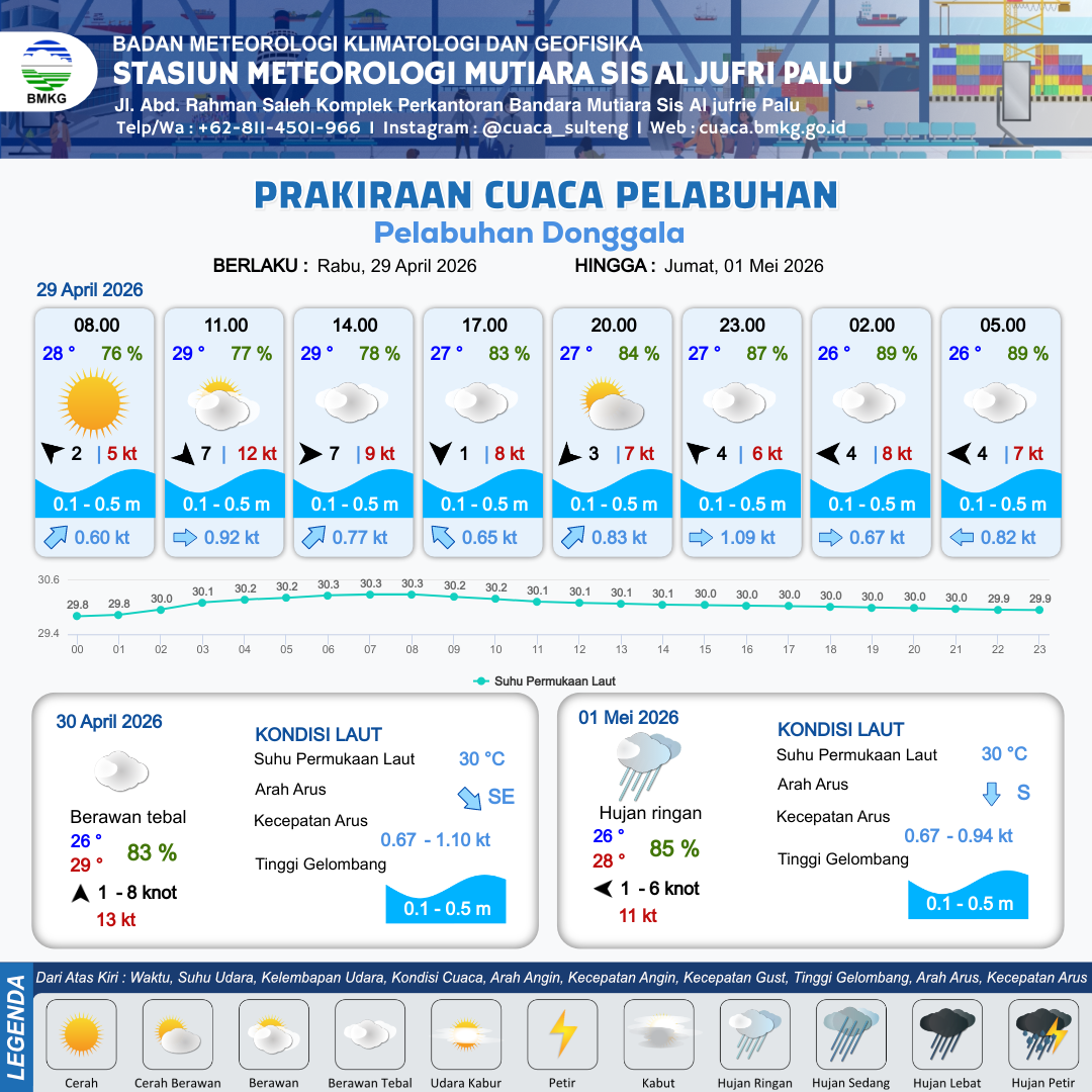 29 Apr 26, 08.00 4 jam kedepan | Utara 1 kt Gust Peningkatan kecepatan angin yang singkat dan tiba-tiba : 6 kt | 0.3 m Tenang | Utara 0.7 Knot | 10 km | 28 °C | 81 % | +0.28 m | |
