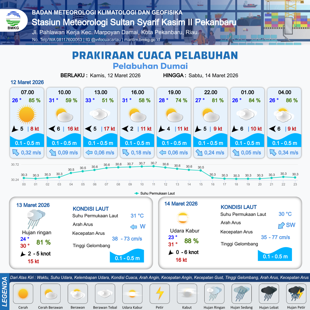 13 Mar 26, 06.00 12 jam yang lalu | Berawan | Timur 6 kt Gust Peningkatan kecepatan angin yang singkat dan tiba-tiba : 18 kt | | | 8 km | 32 °C | 57 % | -0.08 m |