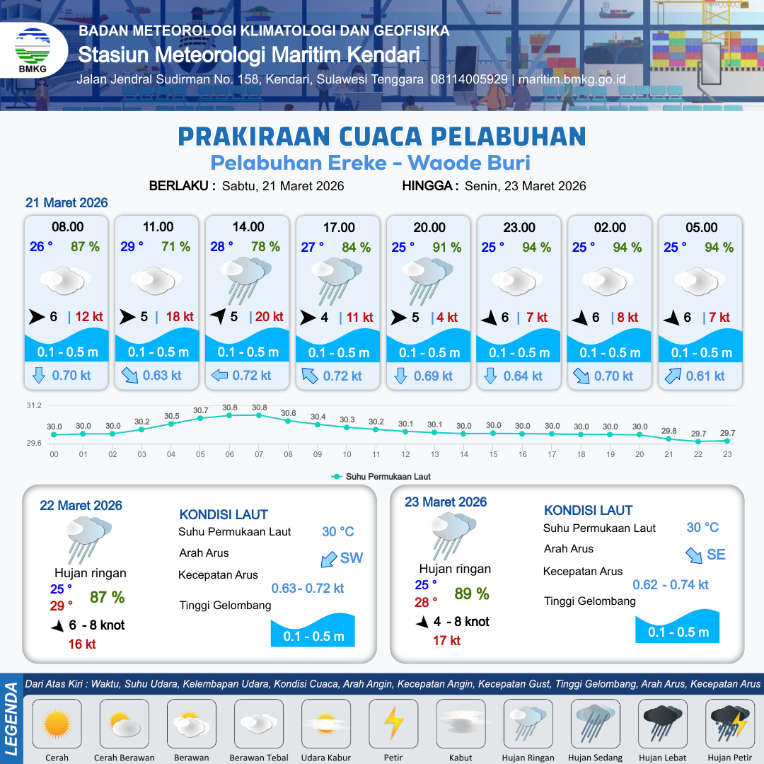 21 Mar 26, 23.00 21 jam kedepan | Barat 6 kt Gust Peningkatan kecepatan angin yang singkat dan tiba-tiba : 7 kt | 0.1 m Tenang | Timur 0.6 Knot | 10 km | 25 °C | 94 % | -0.17 m |