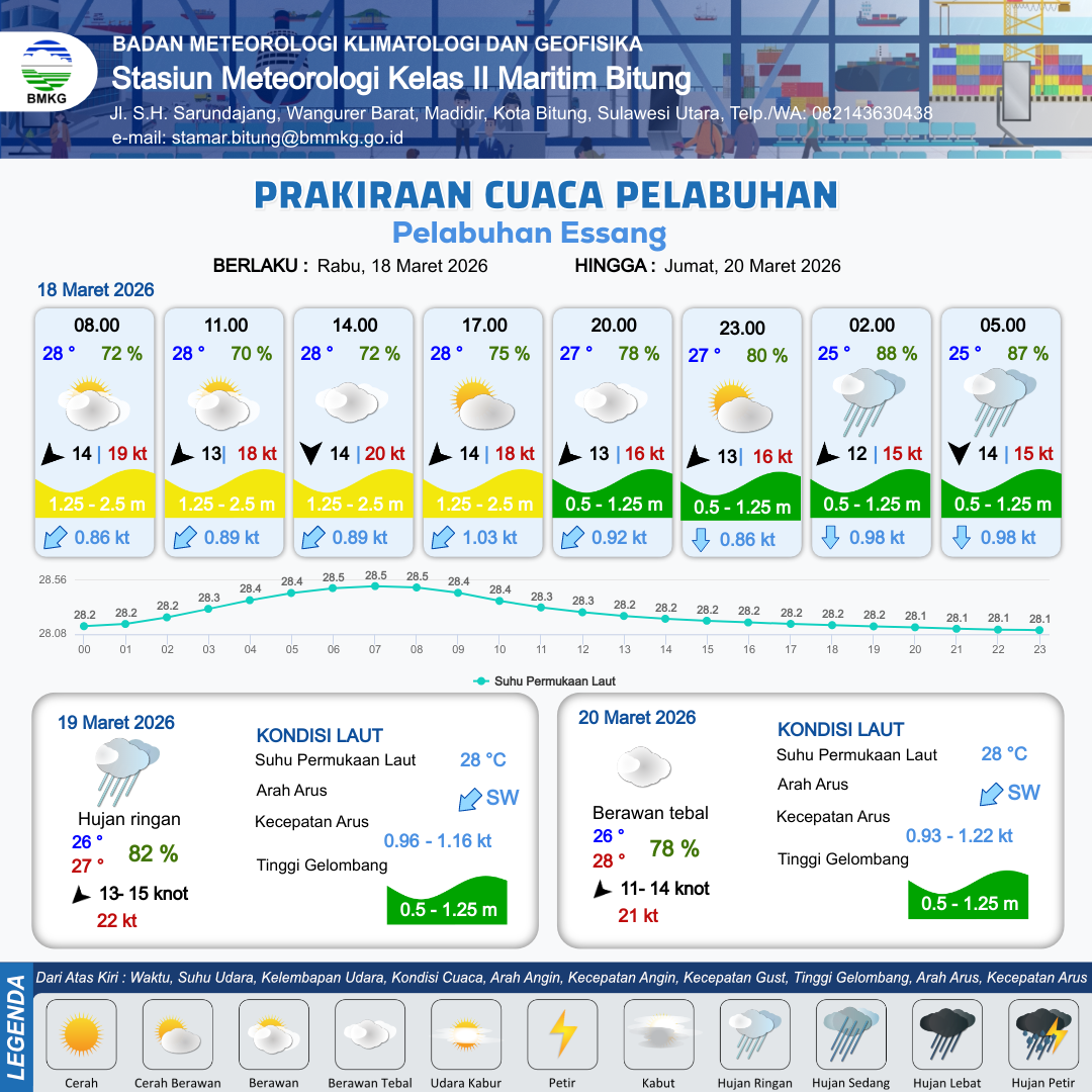 18 Mar 26, 06.00 9 jam kedepan | Utara 14 kt Gust Peningkatan kecepatan angin yang singkat dan tiba-tiba : 22 kt | 1.4 m Sedang | Barat Daya 1.0 Knot | 10 km | 28 °C | 74 % | -0.32 m | |