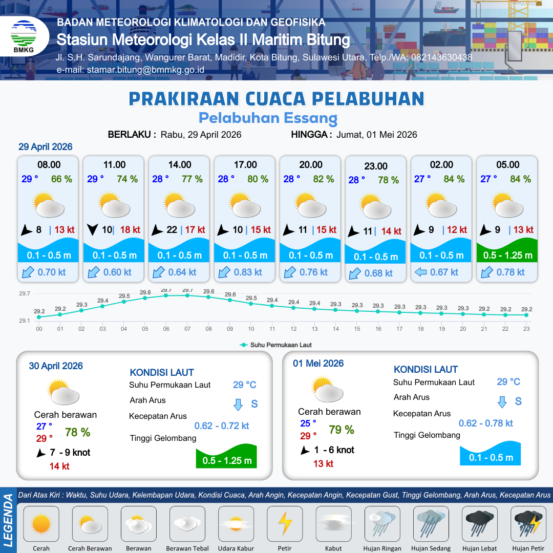 29 Apr 26, 03.00 2 jam kedepan | Utara 10 kt Gust Peningkatan kecepatan angin yang singkat dan tiba-tiba : 18 kt | 0.5 m Rendah | Barat Daya 0.6 Knot | 10 km | 29 °C | 74 % | -0.80 m | |