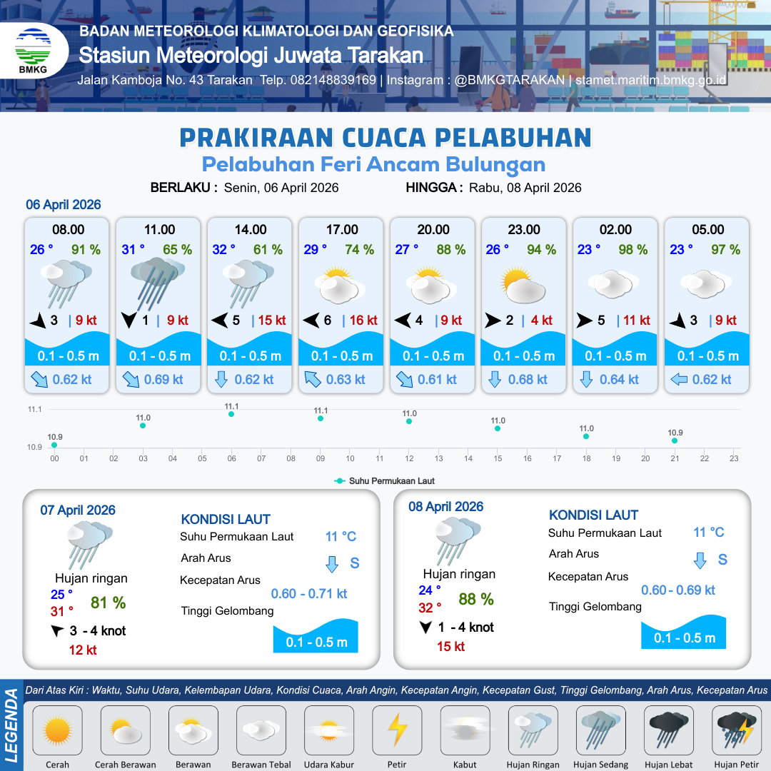 6 Apr 26, 09.00 2 jam kedepan | Timur 6 kt Gust Peningkatan kecepatan angin yang singkat dan tiba-tiba : 16 kt | 0.5 m Rendah | Barat Laut 0.6 Knot | 10 km | 29 °C | 74 % | +0.27 m | |