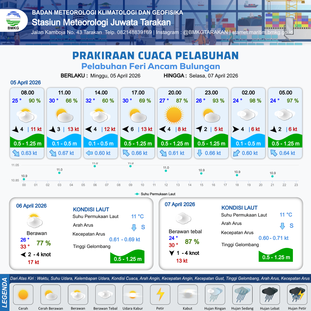 4 Apr 26, 21.00 3 jam kedepan | Cerah Berawan | Barat 3 kt Gust Peningkatan kecepatan angin yang singkat dan tiba-tiba : 12 kt | | | 10 km | 23 °C | 98 % | +0.27 m |