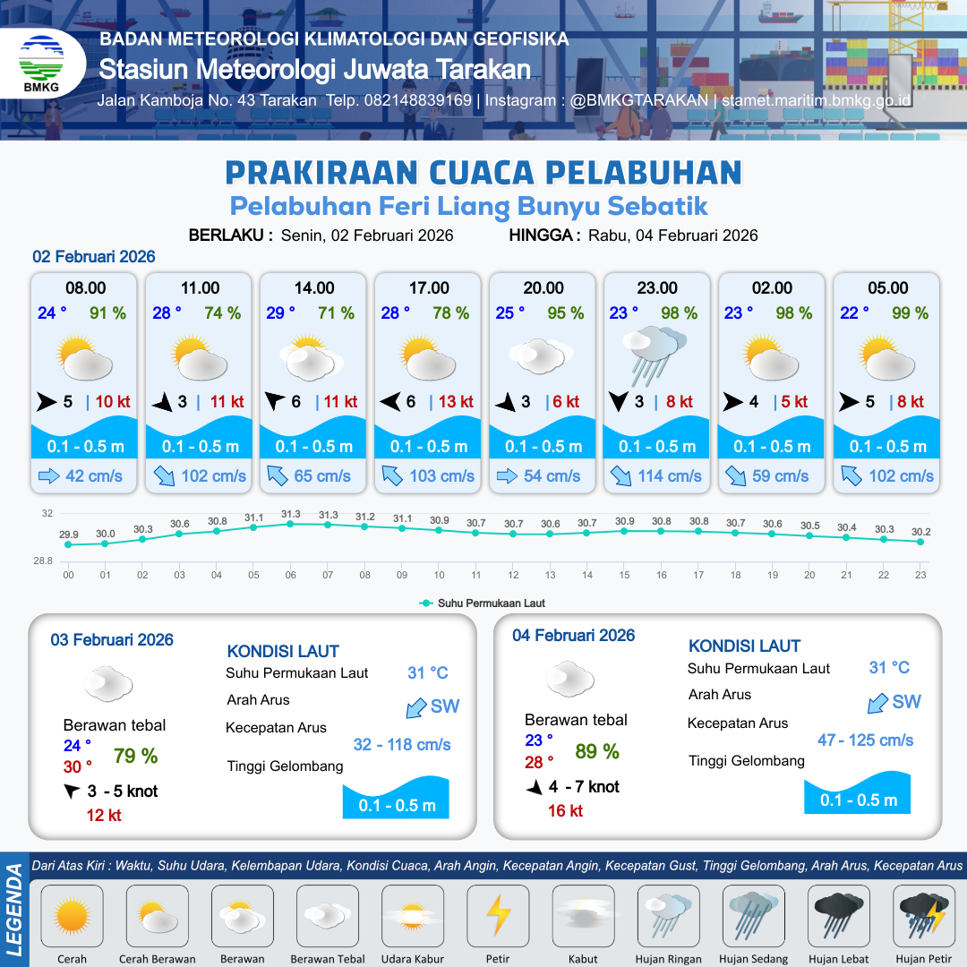 1 Feb 26, 23.00 2 jam kedepan | Berawan | Barat 5 kt Gust Peningkatan kecepatan angin yang singkat dan tiba-tiba : 7 kt | | | 10 km | 23 °C | 97 % | +0.61 m |