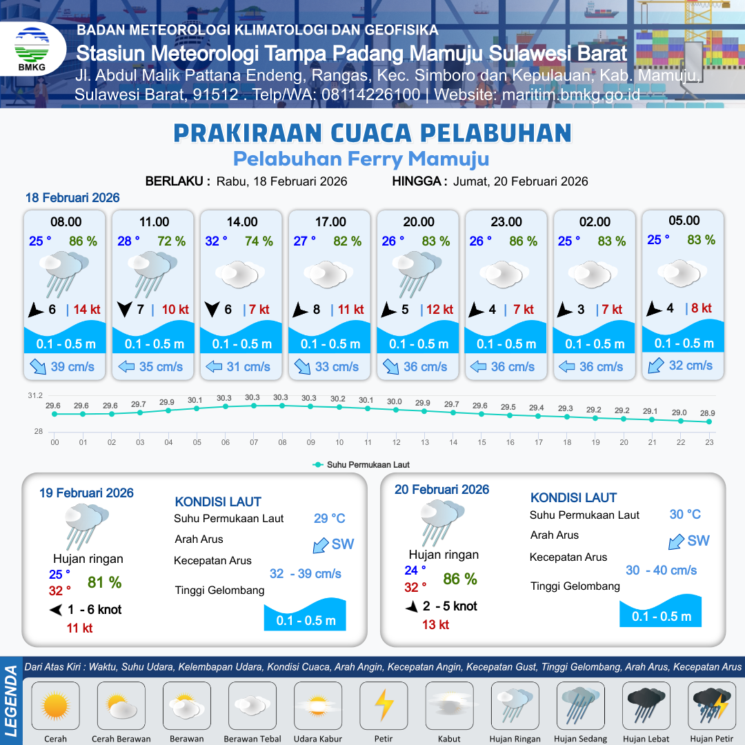 18 Feb 26, 22.00 2 jam kedepan | Hujan Ringan | Timur Laut 4 kt Gust Peningkatan kecepatan angin yang singkat dan tiba-tiba : 9 kt | | | 7 km | 25 °C | 85 % | +0.13 m |