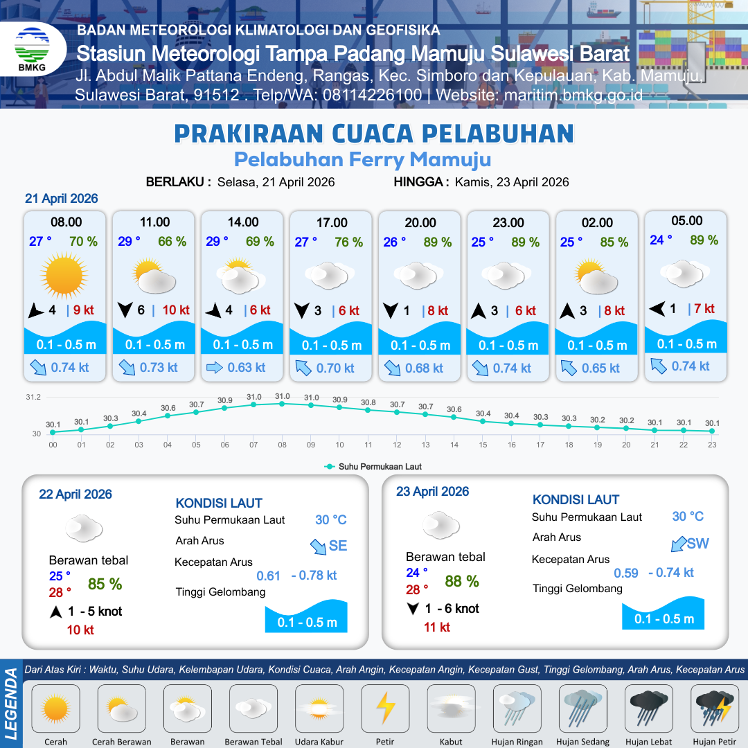21 Apr 26, 09.00 11 jam kedepan | Utara 6 kt Gust Peningkatan kecepatan angin yang singkat dan tiba-tiba : 12 kt | 0.1 m Tenang | Barat Laut 0.7 Knot | 7 km | 28 °C | 85 % | -0.03 m | |