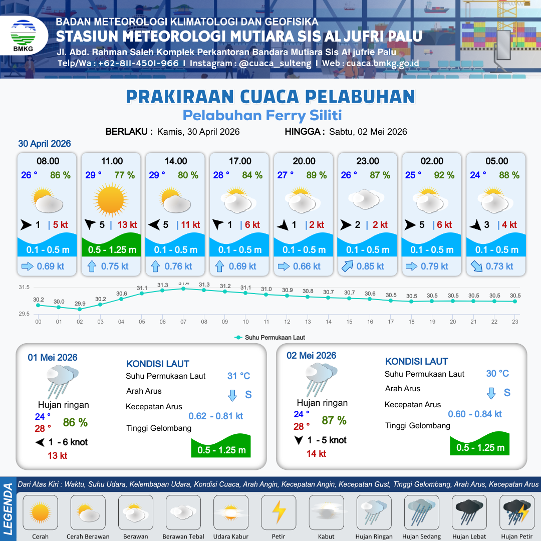 30 Apr 26, 23.00 4 jam kedepan | Cerah Berawan | Barat 3 kt Gust Peningkatan kecepatan angin yang singkat dan tiba-tiba : 5 kt | | | 10 km | 26 °C | 88 % | -0.39 m |