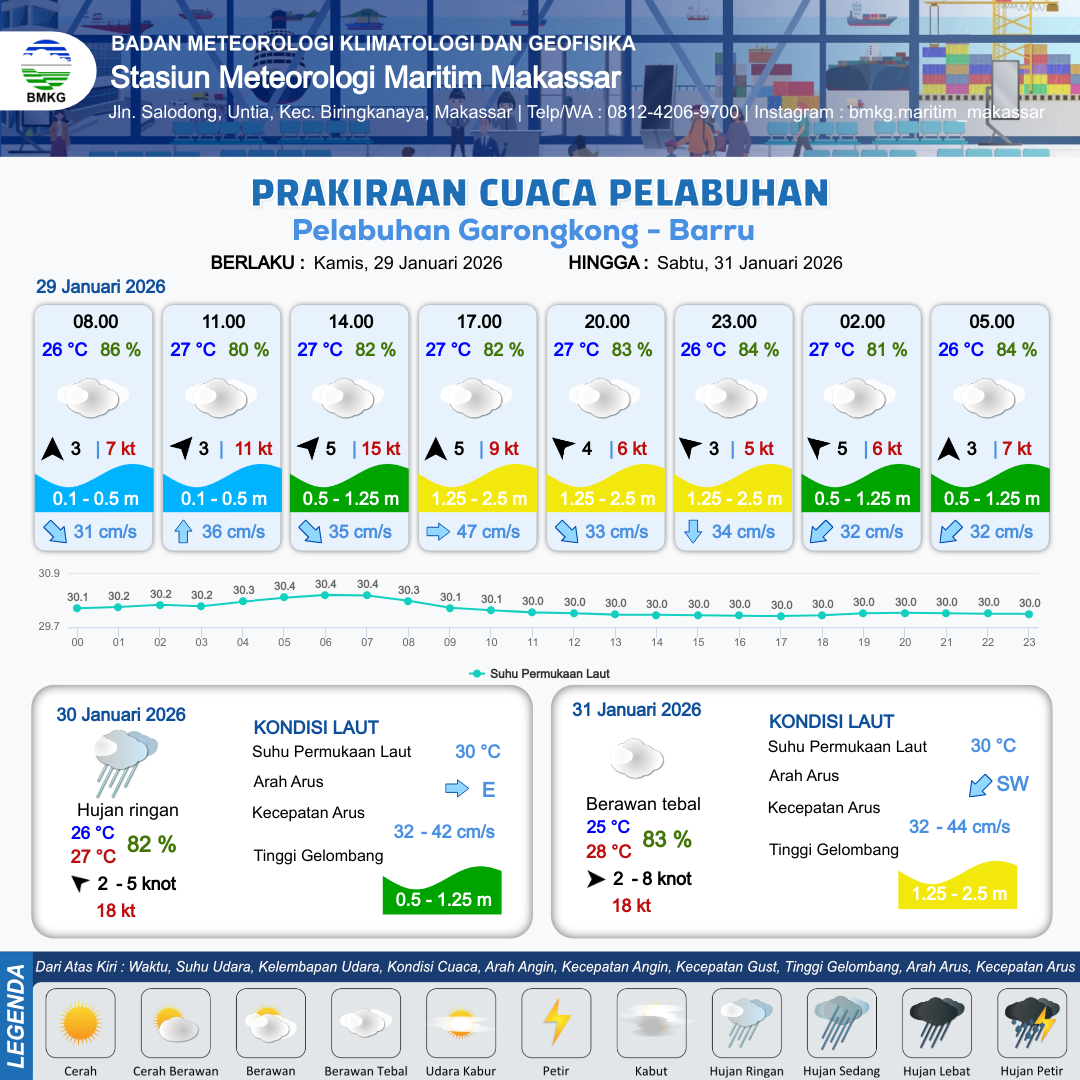 29 Jan 26, 22.00 2 jam kedepan | Berawan Tebal | Selatan 3 kt Gust Peningkatan kecepatan angin yang singkat dan tiba-tiba : 5 kt | | | 10 km | 26 °C | 83 % | -0.43 m |