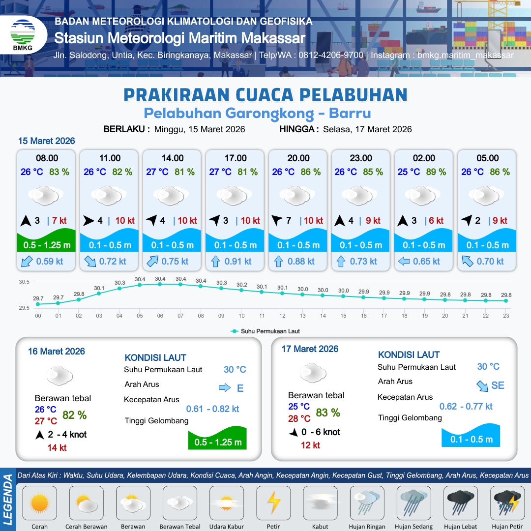 15 Mar 26, 06.00 14 jam yang lalu | Berawan Tebal | Barat Daya 4 kt Gust Peningkatan kecepatan angin yang singkat dan tiba-tiba : 10 kt | | | 10 km | 27 °C | 81 % | +0.29 m |