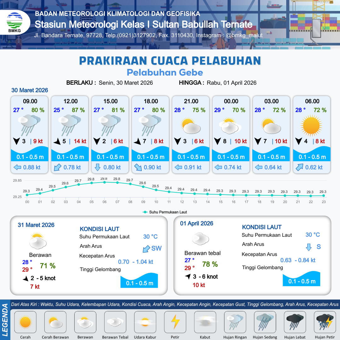 30 Mar 26, 23.00 5 jam kedepan | Cerah Berawan | Barat Laut 2 kt Gust Peningkatan kecepatan angin yang singkat dan tiba-tiba : 6 kt | | | 10 km | 29 °C | 70 % | +0.00 m |
