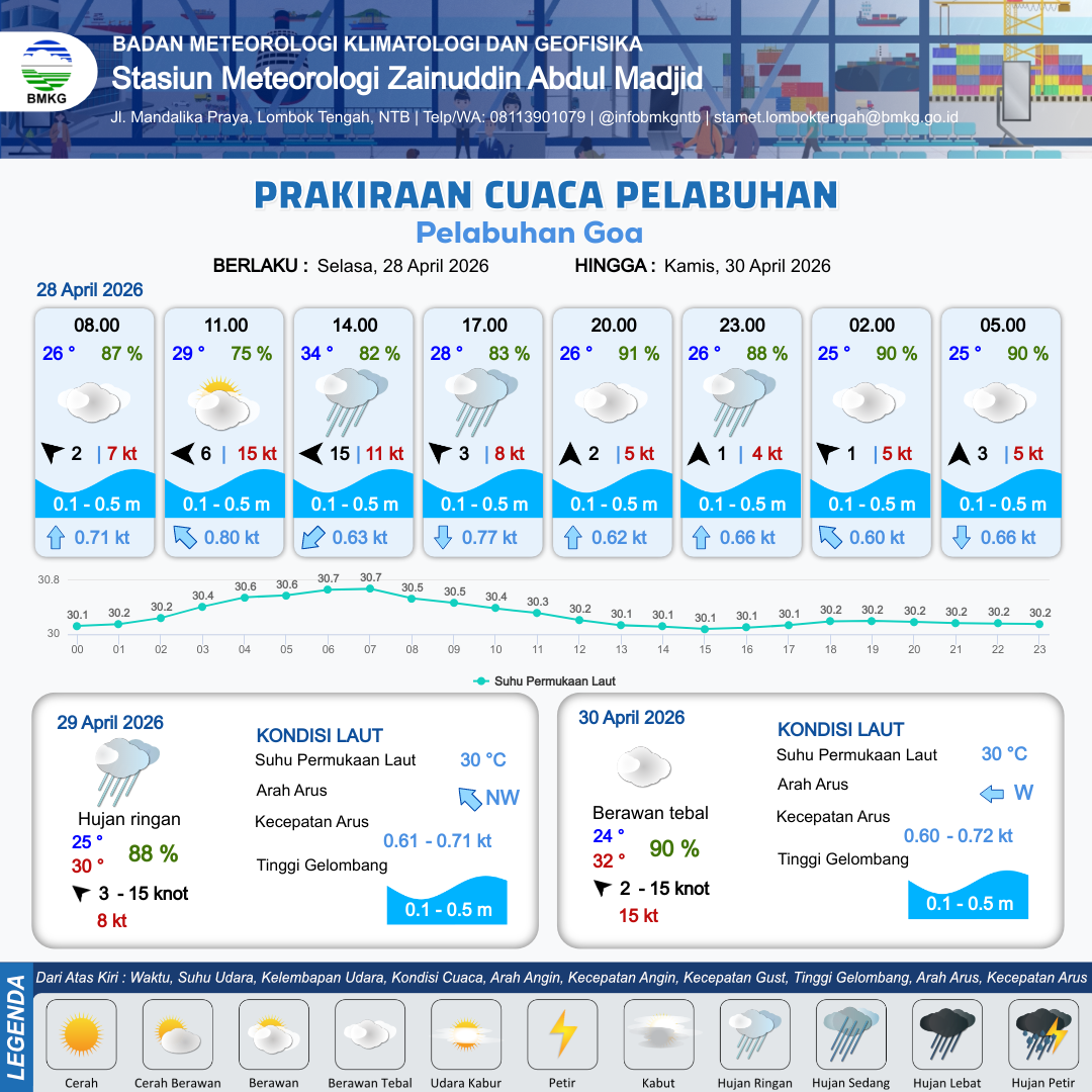 27 Apr 26, 23.00 17 jam kedepan | Tenggara 2 kt Gust Peningkatan kecepatan angin yang singkat dan tiba-tiba : 5 kt | 0.1 m Tenang | Utara 0.7 Knot | 10 km | 25 °C | 90 % | +0.11 m |