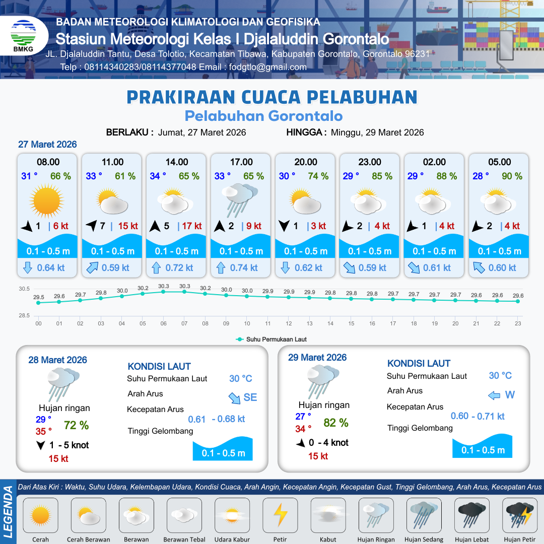 27 Mar 26, 03.00 15 jam yang lalu | Cerah Berawan | Barat Daya 7 kt Gust Peningkatan kecepatan angin yang singkat dan tiba-tiba : 15 kt | | | 10 km | 33 °C | 61 % | +0.27 m |
