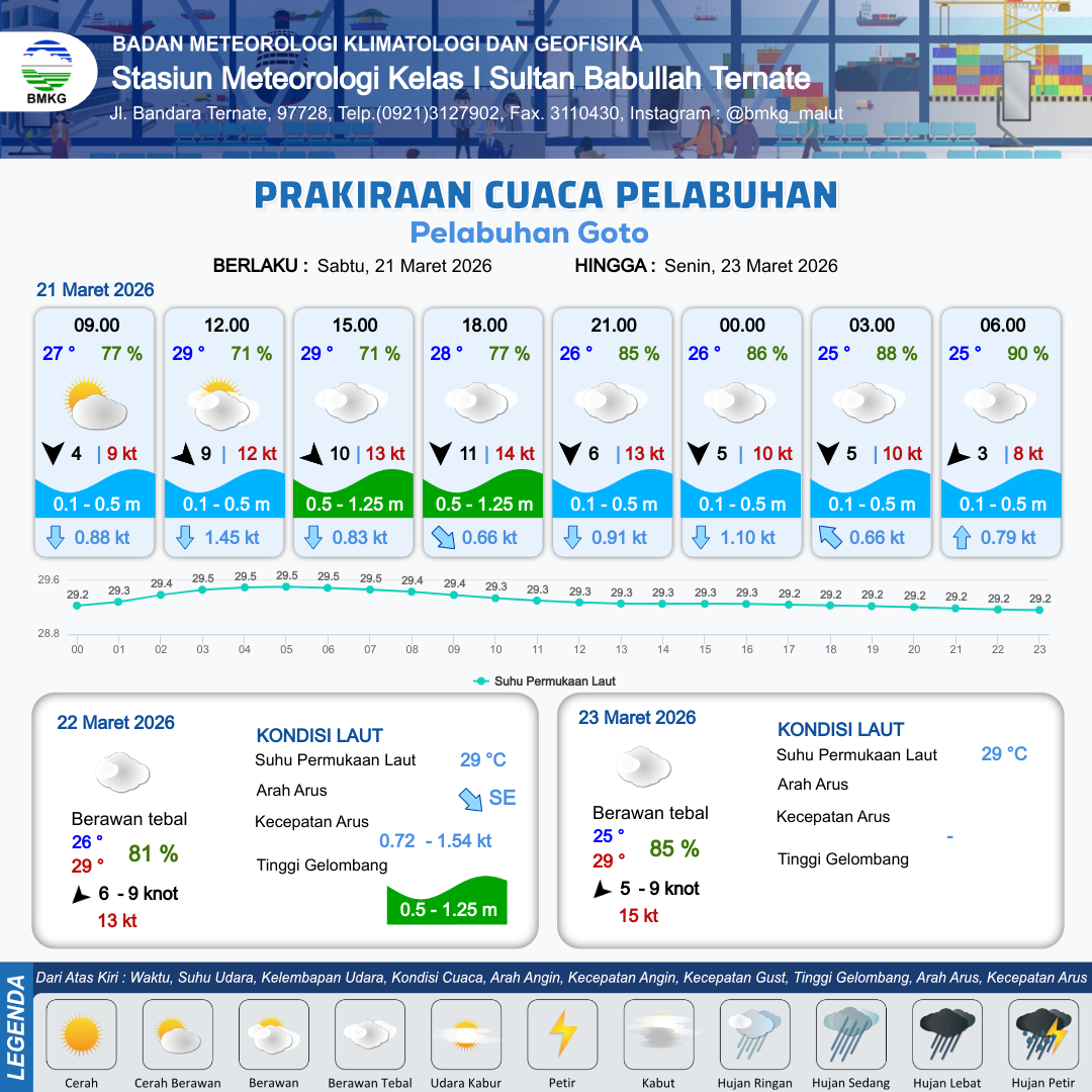 21 Mar 26, 22.00 15 jam kedepan | Timur Laut 3 kt Gust Peningkatan kecepatan angin yang singkat dan tiba-tiba : 9 kt | 0.1 m Tenang | - Knot | 10 km | 25 °C | 88 % | +0.52 m | |