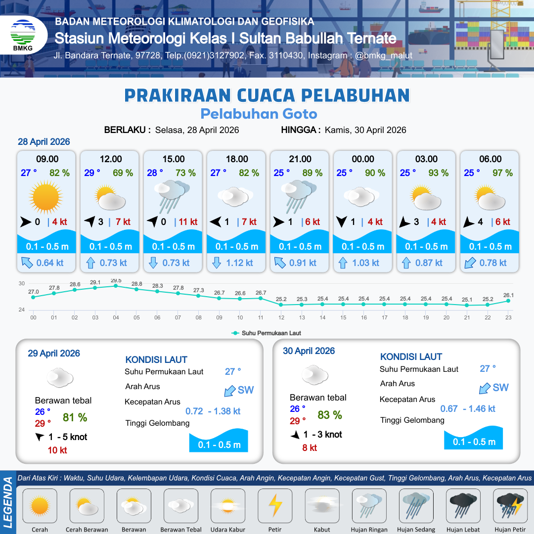 26 Apr 26, 23.00 15 jam kedepan | Timur Laut 2 kt Gust Peningkatan kecepatan angin yang singkat dan tiba-tiba : 4 kt | 0.1 m Tenang | Selatan 0.8 Knot | 10 km | 27 °C | 82 % | -0.07 m |
