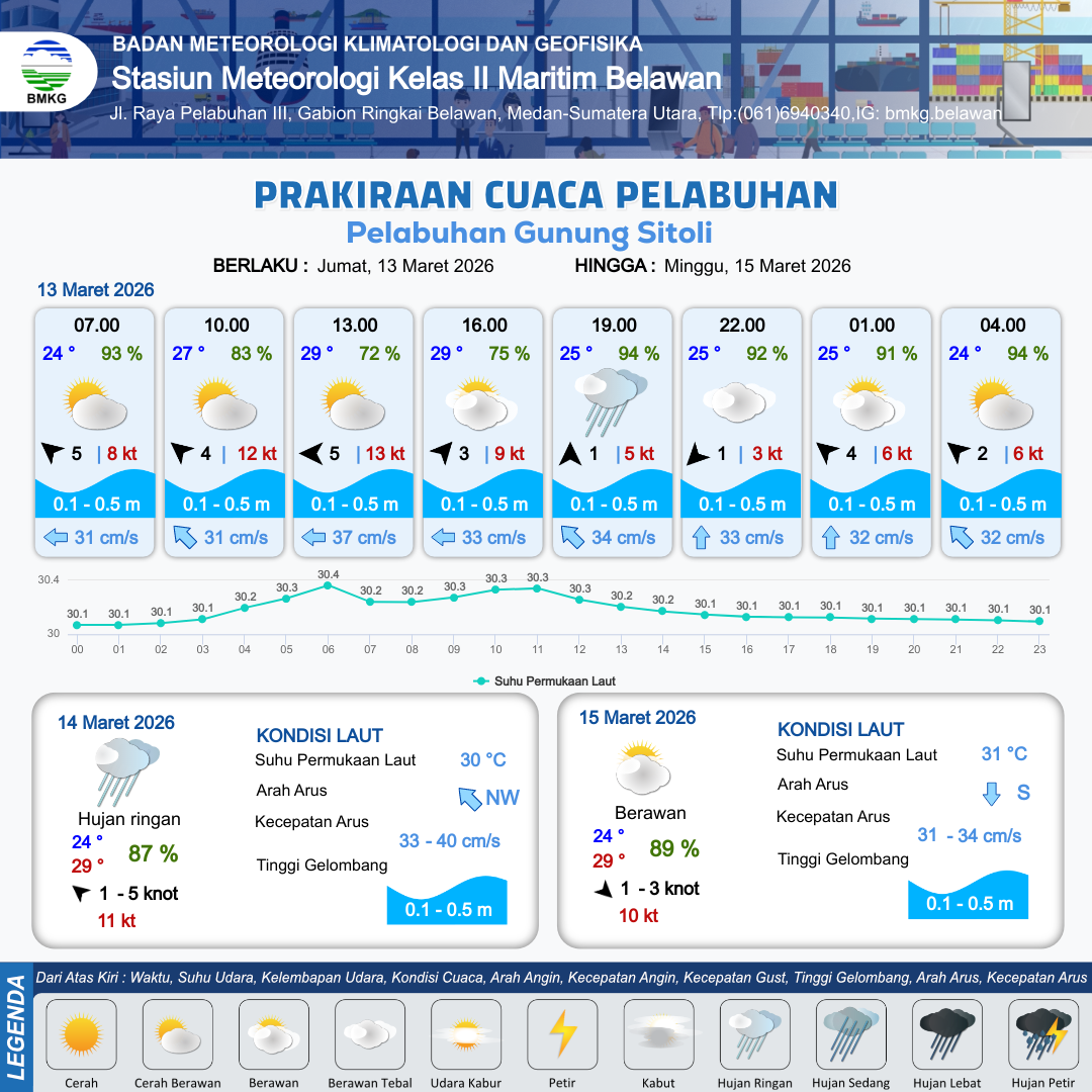 13 Mar 26, 13.00 4 jam kedepan | Selatan 1 kt Gust Peningkatan kecepatan angin yang singkat dan tiba-tiba : 3 kt | 0.2 m Tenang | Utara 33.0 cm/s | 10 km | 25 °C | 94 % | -0.17 m | |
