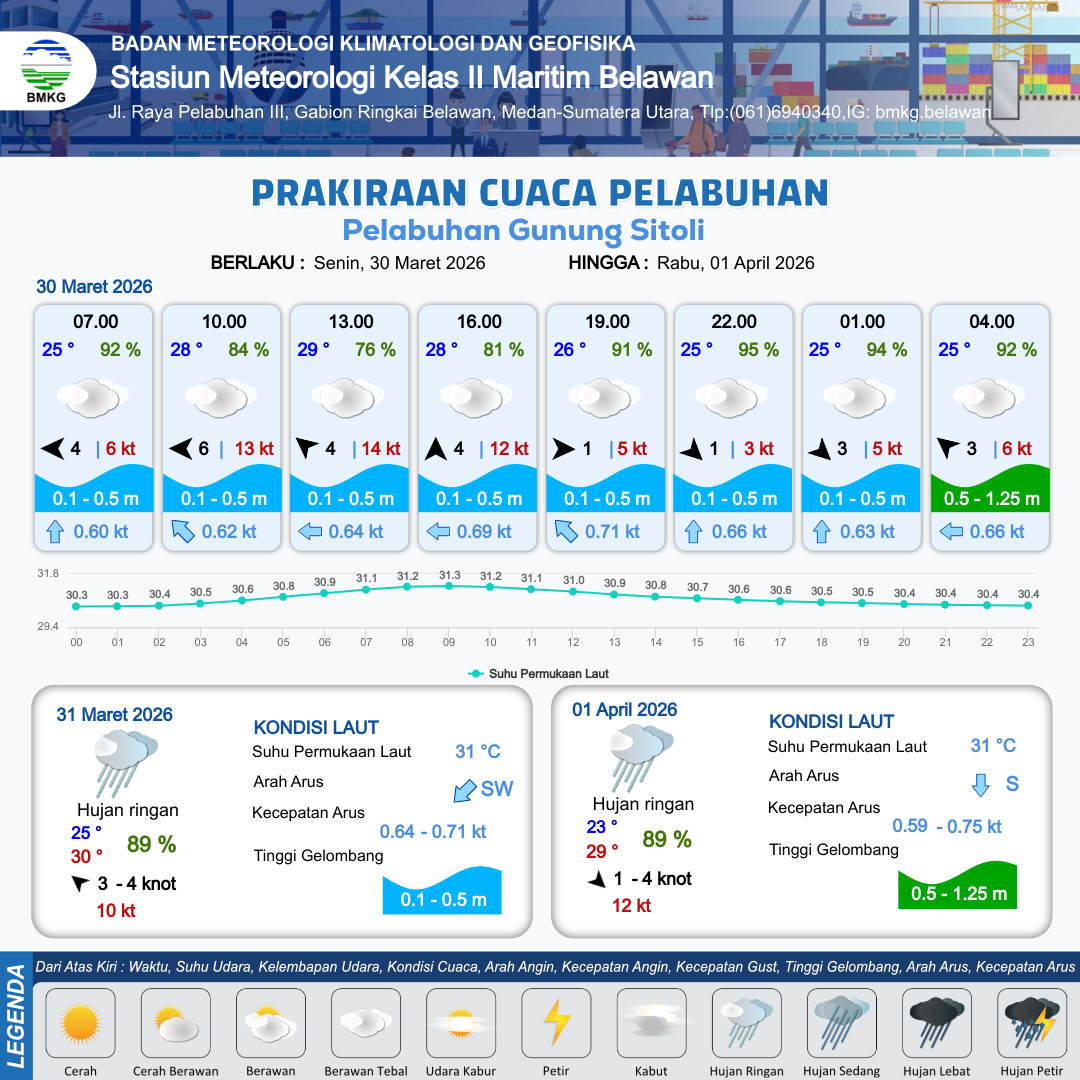 30 Mar 26, 06.00 3 jam kedepan | Tenggara 4 kt Gust Peningkatan kecepatan angin yang singkat dan tiba-tiba : 14 kt | 0.1 m Tenang | Barat 0.6 Knot | 10 km | 29 °C | 76 % | -0.11 m | |