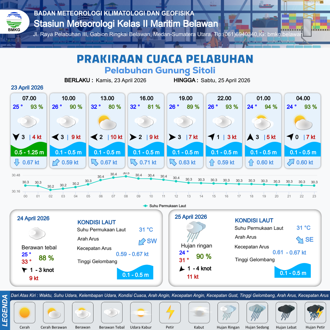 23 Apr 26, 05.00 23 jam kedepan | Timur 2 kt Gust Peningkatan kecepatan angin yang singkat dan tiba-tiba : 9 kt | 0.2 m Tenang | Barat Laut 0.6 Knot | 8 km | 31 °C | 81 % | +0.22 m | |