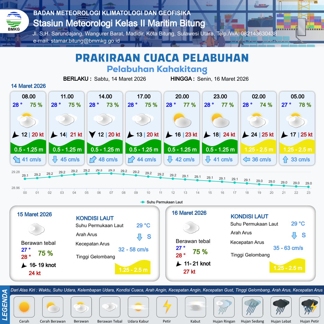 14 Mar 26, 17.00 2 jam yang lalu | Cerah Berawan | Timur Laut 24 kt Gust Peningkatan kecepatan angin yang singkat dan tiba-tiba : 24 kt | | | 9 km | 28 °C | 75 % | -0.30 m |