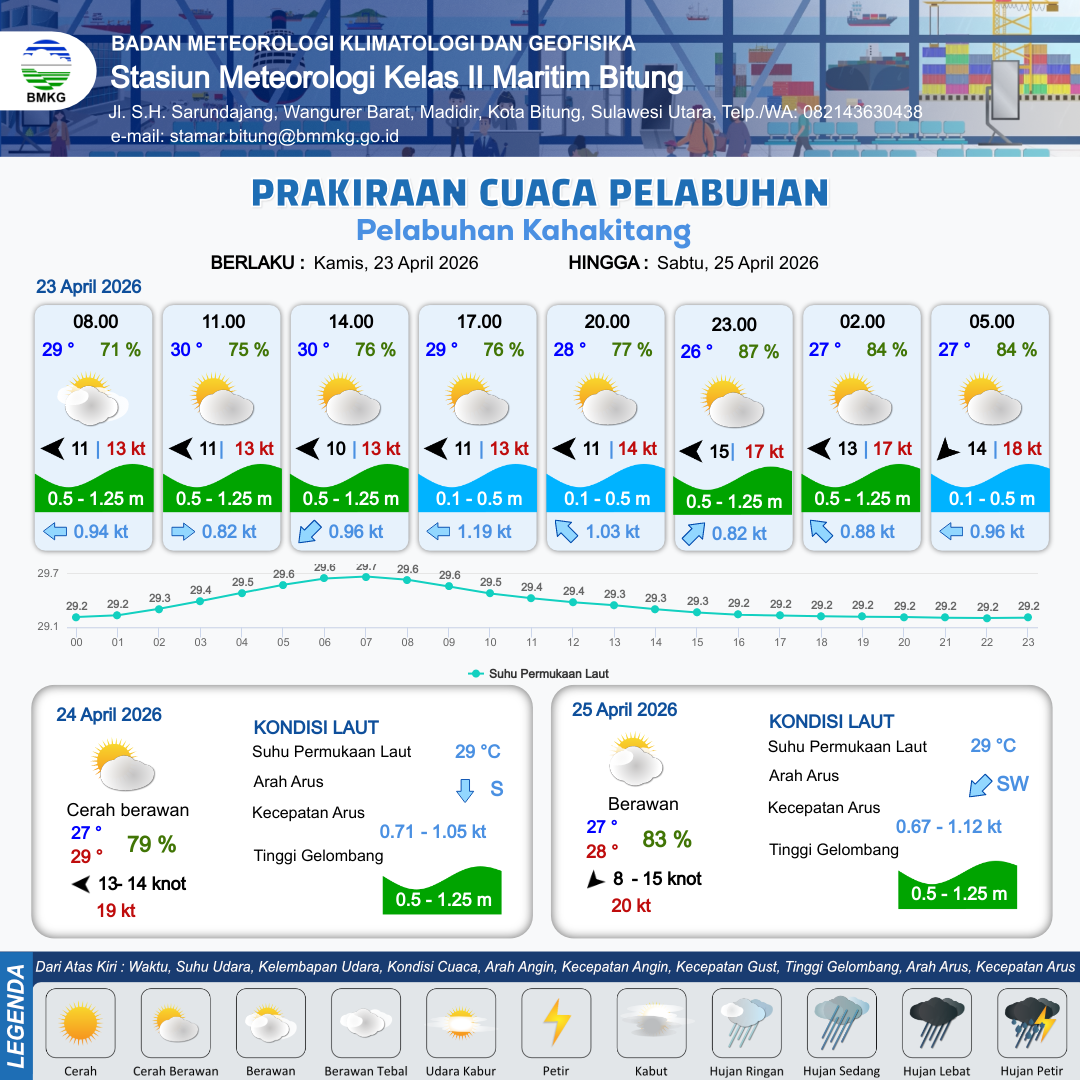 23 Apr 26, 11.00 2 jam kedepan | Timur 11 kt Gust Peningkatan kecepatan angin yang singkat dan tiba-tiba : 14 kt | 0.5 m Rendah | Barat Laut 1.2 Knot | 9 km | 29 °C | 77 % | -0.34 m | |
