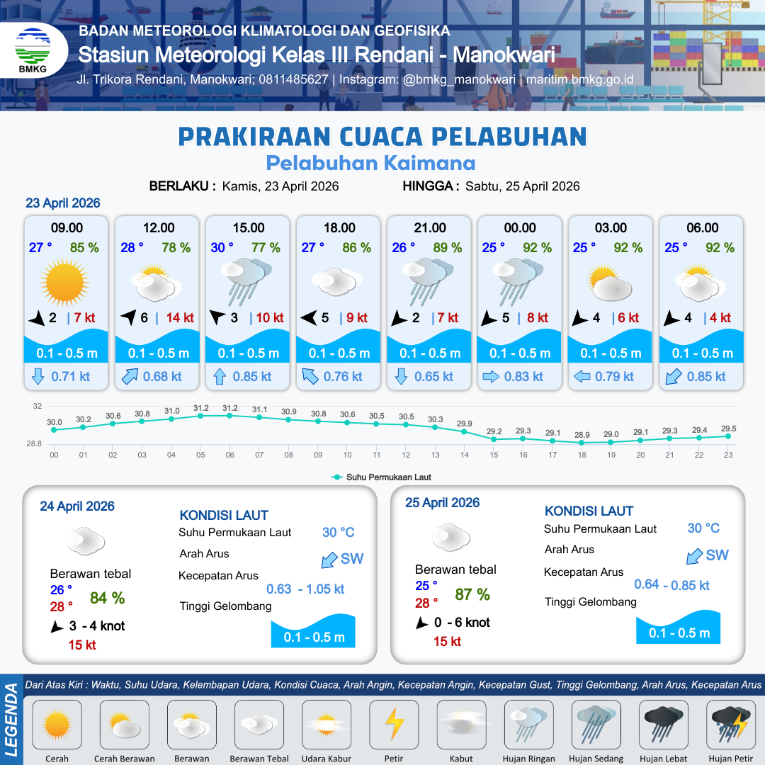 23 Apr 26, 04.00 5 jam kedepan | Barat Daya 6 kt Gust Peningkatan kecepatan angin yang singkat dan tiba-tiba : 15 kt | 0.1 m Tenang | Utara 0.7 Knot | 6 km | 28 °C | 79 % | -0.35 m | |