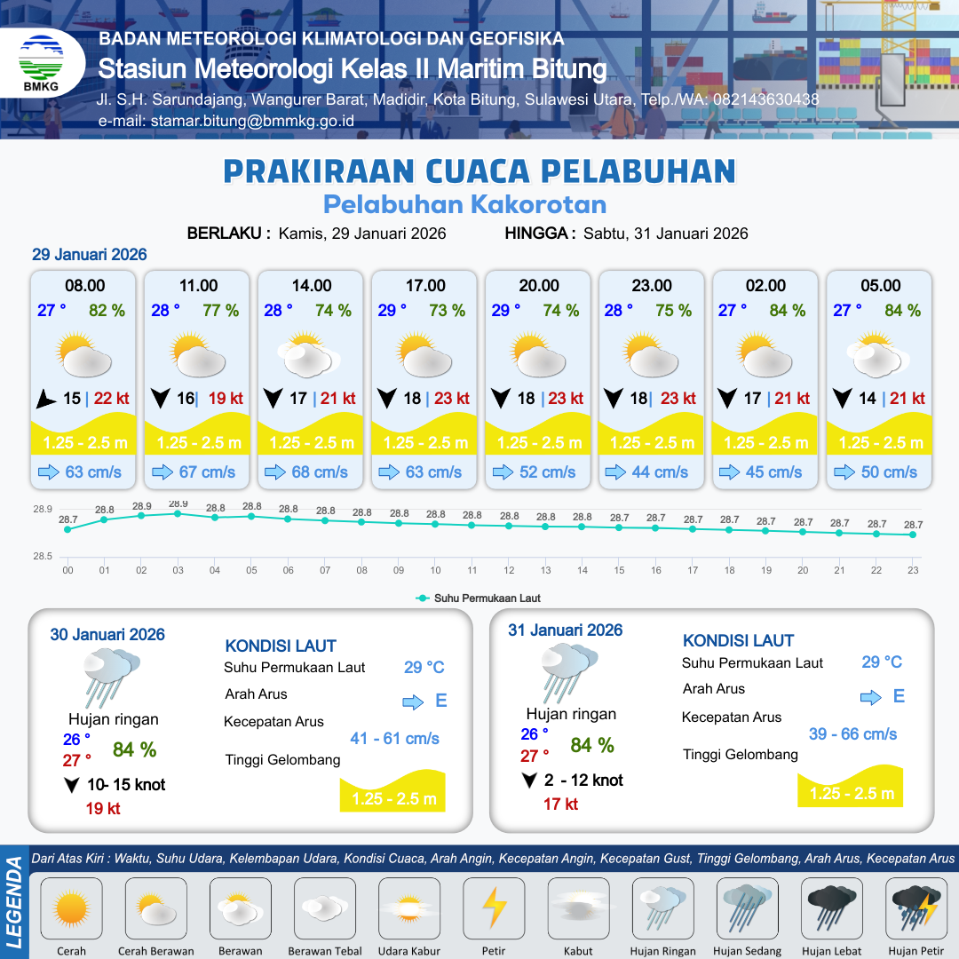 29 Jan 26, 22.00 4 jam kedepan | Berawan | Utara 14 kt Gust Peningkatan kecepatan angin yang singkat dan tiba-tiba : 21 kt | | | 10 km | 26 °C | 87 % | -0.01 m |