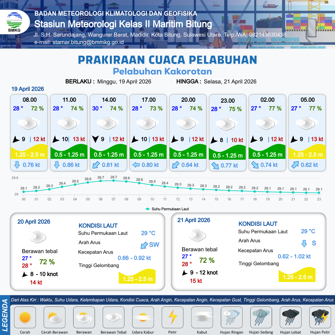 18 Apr 26, 20.00 2 jam kedepan | Cerah Berawan | Timur Laut 7 kt Gust Peningkatan kecepatan angin yang singkat dan tiba-tiba : 10 kt | | | 9 km | 28 °C | 72 % | +0.50 m |