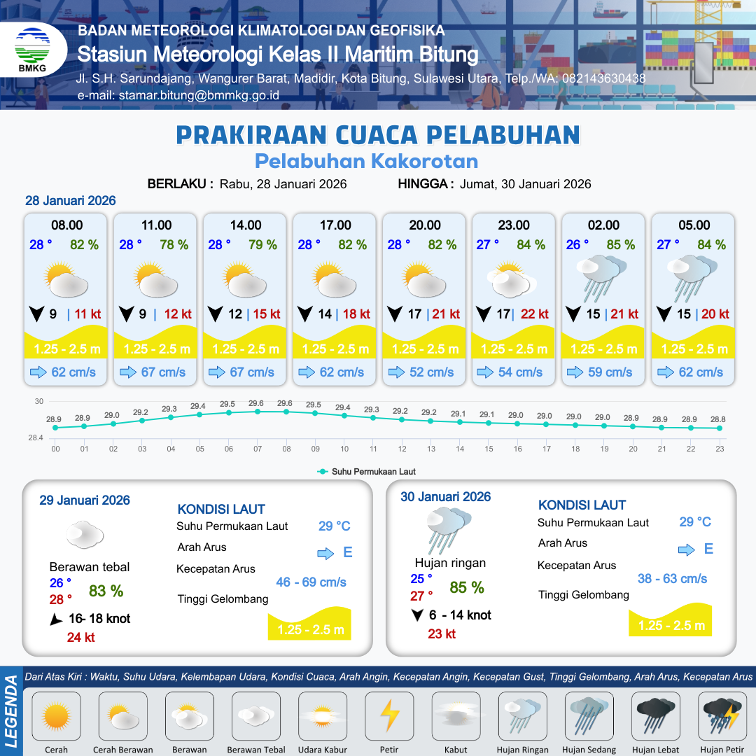 28 Jan 26, 21.00 4 jam kedepan | Hujan Ringan | Utara 15 kt Gust Peningkatan kecepatan angin yang singkat dan tiba-tiba : 20 kt | | | 10 km | 27 °C | 84 % | -0.10 m |