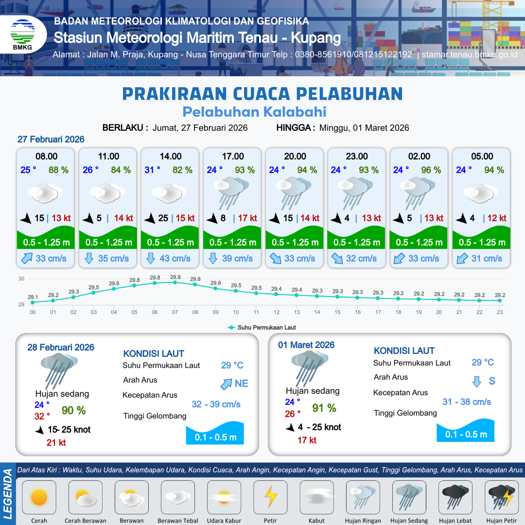 27 Feb 26, 22.00 2 jam kedepan | Hujan Ringan | Barat Laut 4 kt Gust Peningkatan kecepatan angin yang singkat dan tiba-tiba : 12 kt | | | 8 km | 24 °C | 94 % | -0.64 m |