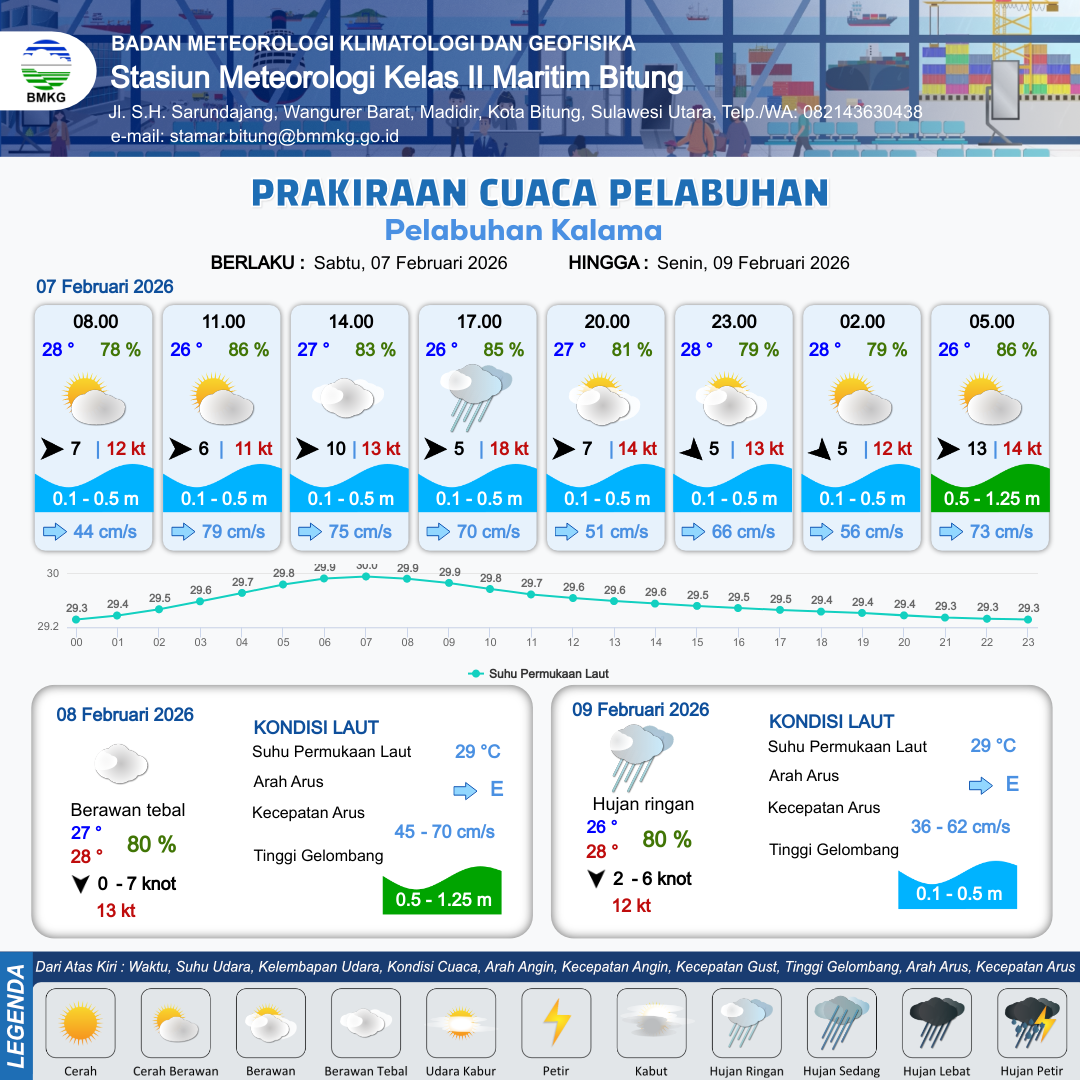 7 Feb 26, 09.00 12 jam kedepan | Barat 9 kt Gust Peningkatan kecepatan angin yang singkat dan tiba-tiba : 14 kt | 0.5 m Rendah | Timur 76.0 cm/s | 5 km | 27 °C | 83 % | -0.09 m | |
