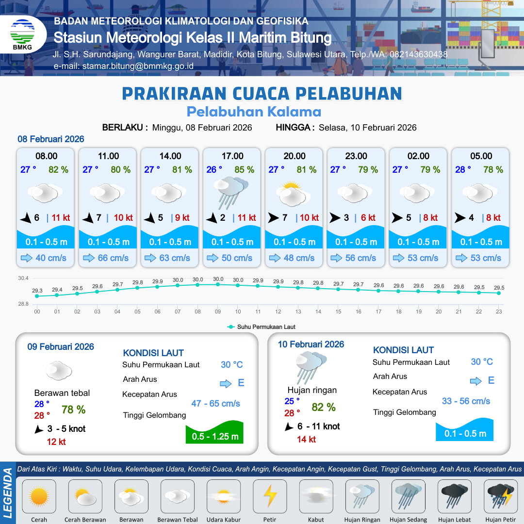 6 Feb 26, 23.00 2 jam kedepan | Barat 13 kt Gust Peningkatan kecepatan angin yang singkat dan tiba-tiba : 13 kt | 0.7 m Rendah | Timur 35.0 cm/s | 5 km | 27 °C | 81 % | +0.22 m |