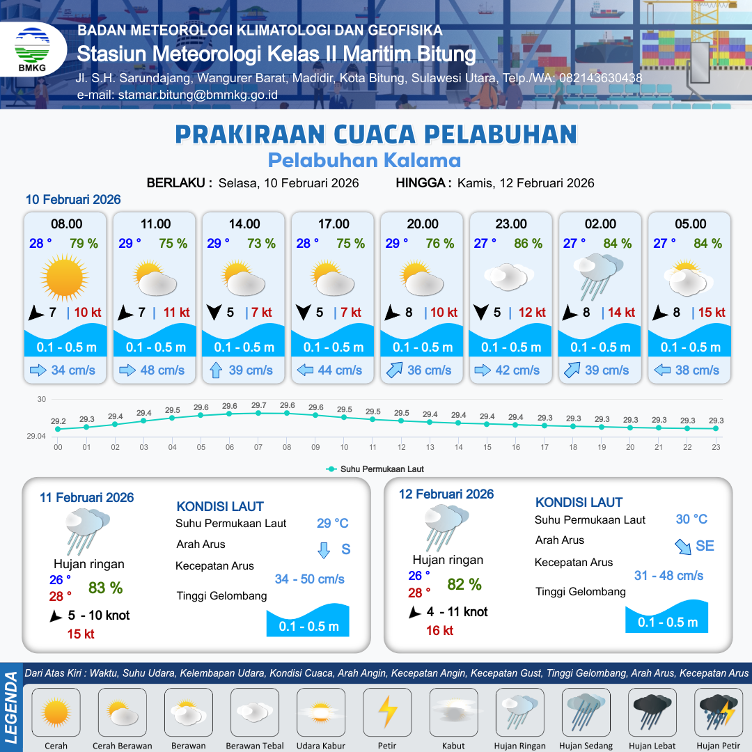10 Feb 26, 12.00 9 jam kedepan | Timur Laut 8 kt Gust Peningkatan kecepatan angin yang singkat dan tiba-tiba : 10 kt | 0.3 m Tenang | Timur Laut 36.0 cm/s | 10 km | 29 °C | 76 % | -0.02 m | |