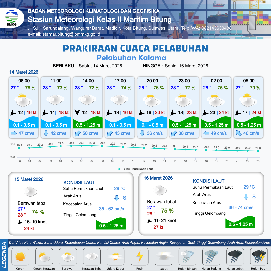 14 Mar 26, 14.00 9 jam kedepan | Timur Laut 18 kt Gust Peningkatan kecepatan angin yang singkat dan tiba-tiba : 21 kt | 0.6 m Rendah | Selatan 37.0 cm/s | 9 km | 28 °C | 77 % | -0.43 m | |