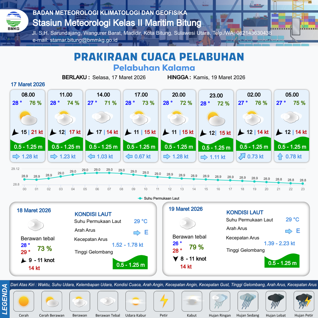 17 Mar 26, 02.00 4 jam kedepan | Timur Laut 12 kt Gust Peningkatan kecepatan angin yang singkat dan tiba-tiba : 19 kt | 0.9 m Rendah | Timur 1.2 Knot | 10 km | 28 °C | 75 % | -0.43 m | |