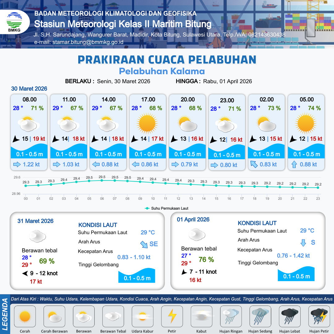 30 Mar 26, 20.00 2 jam kedepan | Cerah | Timur Laut 12 kt Gust Peningkatan kecepatan angin yang singkat dan tiba-tiba : 15 kt | | | 9 km | 28 °C | 74 % | +0.36 m |