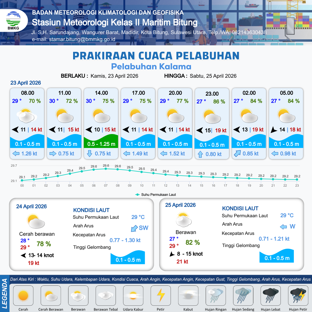 21 Apr 26, 09.00 24 jam kedepan | Timur Laut 11 kt Gust Peningkatan kecepatan angin yang singkat dan tiba-tiba : 15 kt | 0.4 m Tenang | Barat 1.6 Knot | 10 km | 29 °C | 66 % | -0.39 m | |