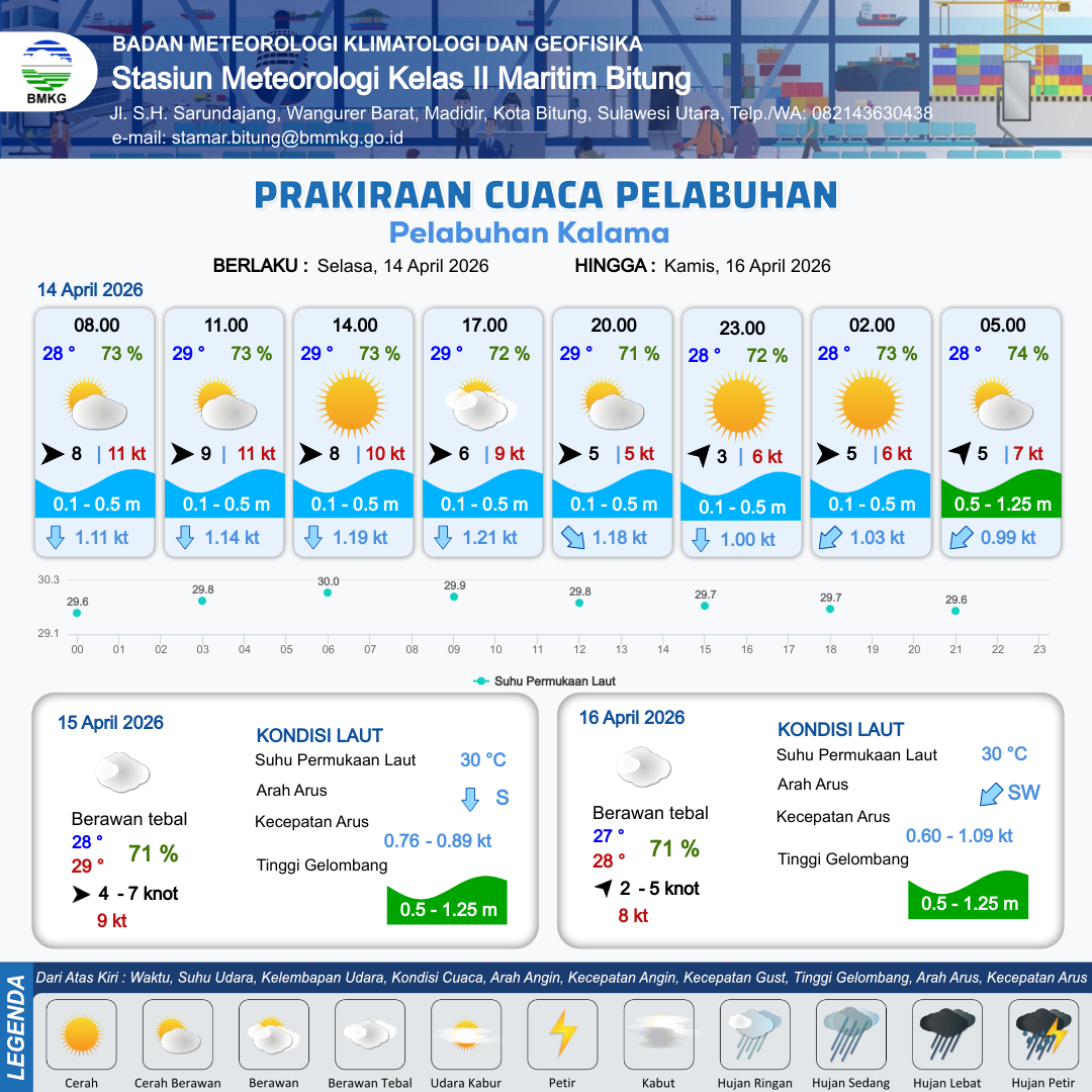 14 Apr 26, 09.00 3 jam kedepan | Barat 6 kt Gust Peningkatan kecepatan angin yang singkat dan tiba-tiba : 9 kt | 0.5 m Rendah | Selatan 1.2 Knot | 10 km | 29 °C | 72 % | +0.66 m | |