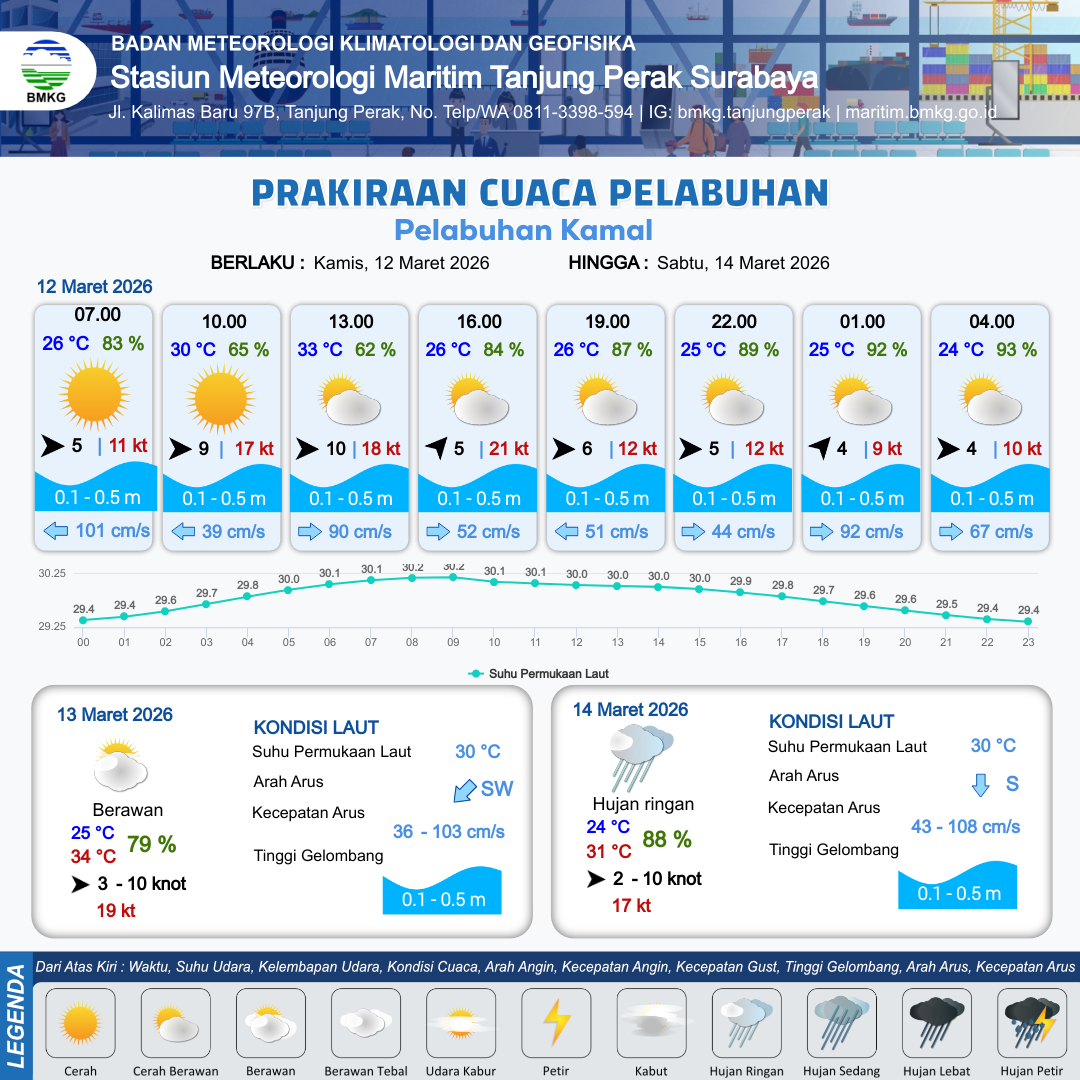 12 Mar 26, 09.00 2 jam kedepan | Barat Daya 5 kt Gust Peningkatan kecepatan angin yang singkat dan tiba-tiba : 21 kt | 0.1 m Tenang | Timur 52.0 cm/s | 10 km | 26 °C | 84 % | +0.46 m | |
