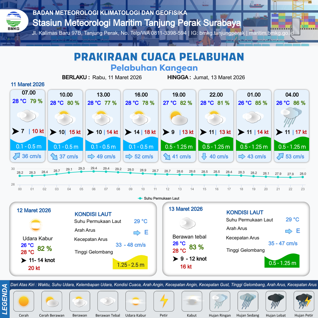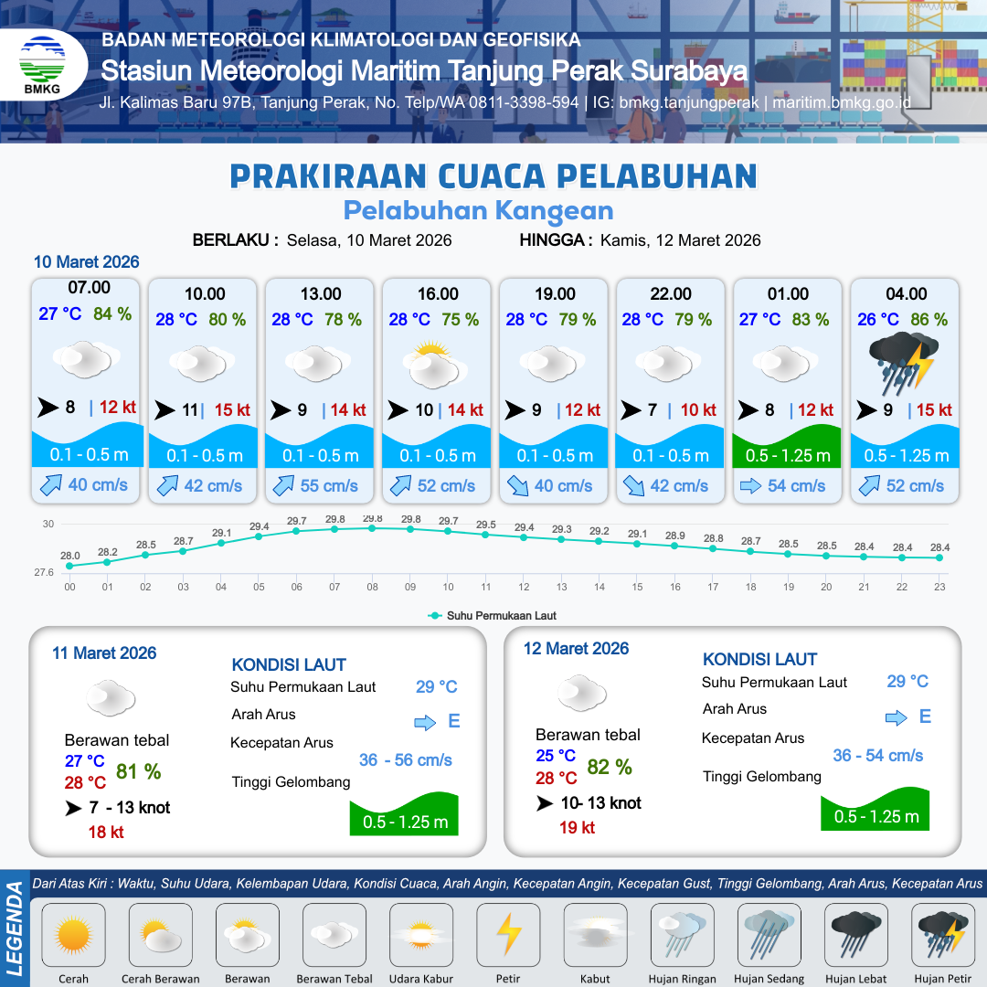 10 Mar 26, 23.00 8 jam kedepan | Barat 7 kt Gust Peningkatan kecepatan angin yang singkat dan tiba-tiba : 12 kt | 0.5 m Rendah | Timur Laut 46.0 cm/s | 10 km | 27 °C | 84 % | +0.08 m |