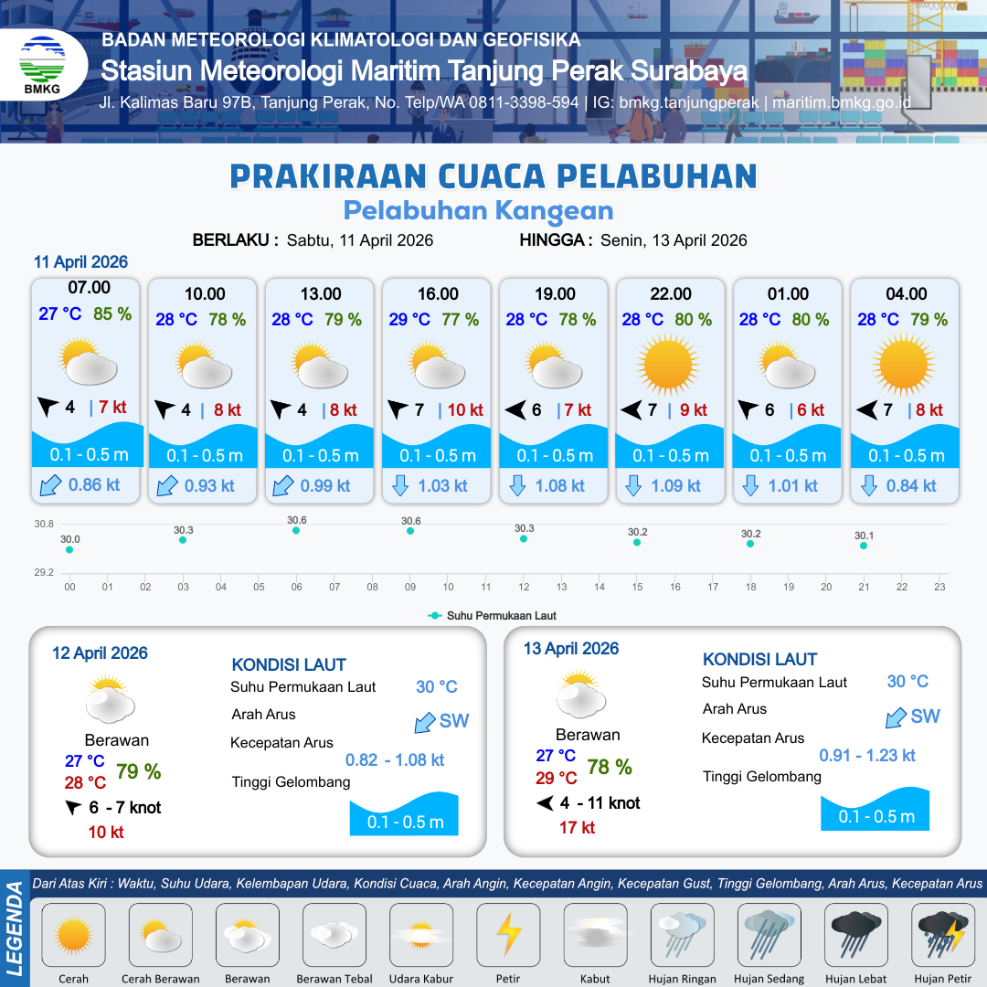 10 Apr 26, 21.00 2 jam kedepan | Berawan | Timur 5 kt Gust Peningkatan kecepatan angin yang singkat dan tiba-tiba : 7 kt | | | 10 km | 27 °C | 86 % | +0.61 m |