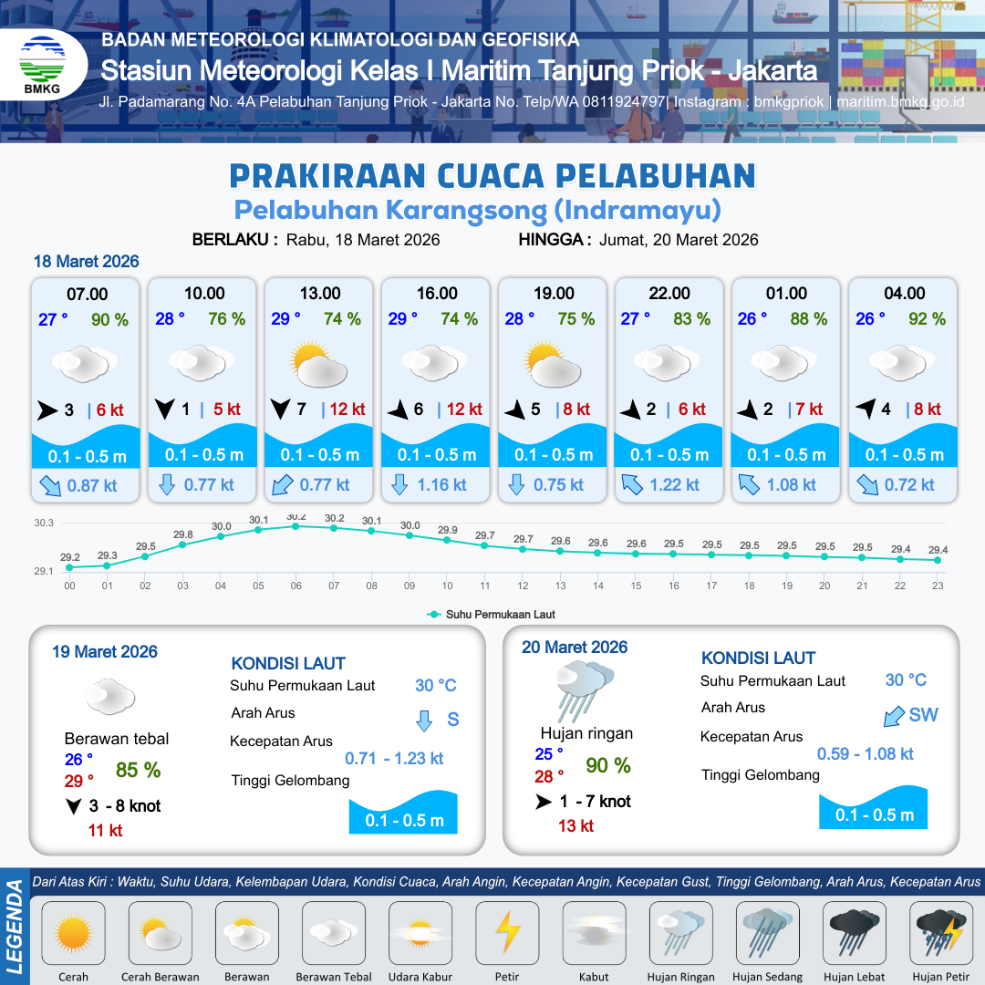 18 Mar 26, 20.00 22 jam kedepan | Barat Daya 4 kt Gust Peningkatan kecepatan angin yang singkat dan tiba-tiba : 7 kt | 0.2 m Tenang | Utara 0.7 Knot | 8 km | 26 °C | 92 % | -0.25 m | |