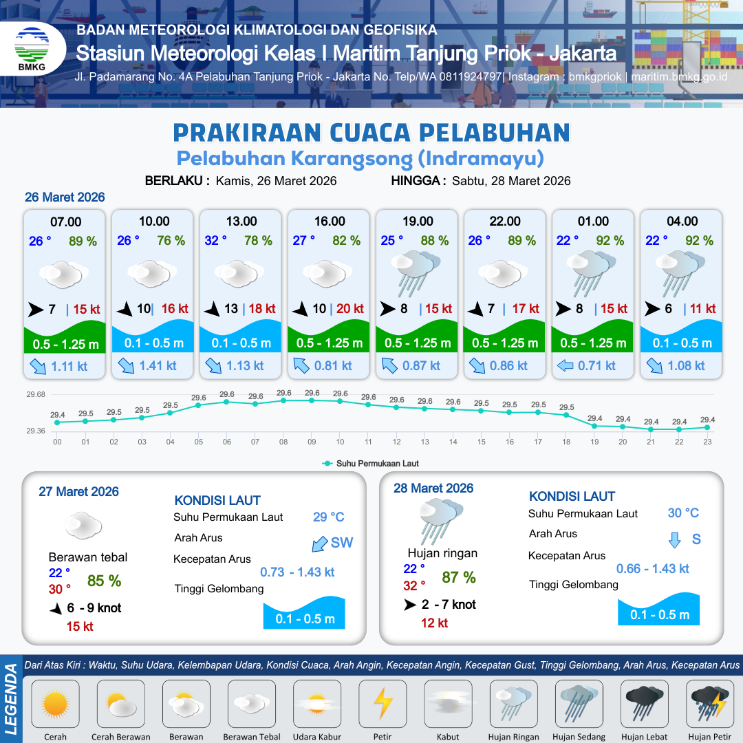 26 Mar 26, 08.00 3 jam kedepan | Barat Laut 10 kt Gust Peningkatan kecepatan angin yang singkat dan tiba-tiba : 19 kt | 0.7 m Rendah | Barat Daya 0.6 Knot | 10 km | 29 °C | 80 % | +0.30 m | |